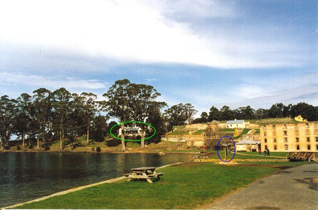The house in the green circle is the Commandant's House. Each room inside is done in a different period from the life of the house. The blue circle is around a cross, placed there to commemorate the 35 people that were killed on April 28, 1996.