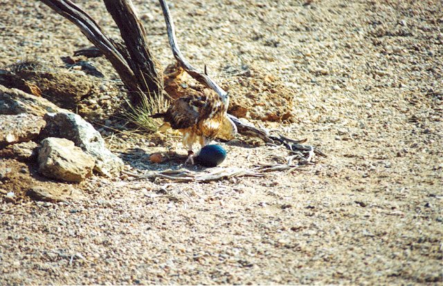 After a couple of tries, the egg is cracked by the dropping rock and the bird gets to eat. The bird was not trained to do this, it is instinctive behavior used any time the species finds an emu egg.