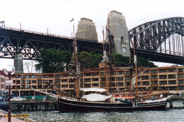 Two sailing ships used as floating restaurants on the Harbour. One is a replica of the H.M.S. Bounty built for a movie a few years ago.